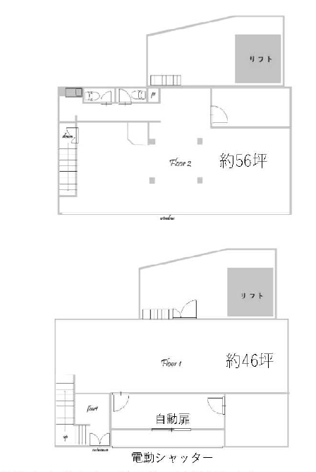 家賃保証加入要、業種相談、24時間使用可、検査済証あり、ロードサイド、一棟貸、電動シャッター付、トイレ専用、1F約168.66㎡ 2F約184.68㎡ 倉庫約30坪(リフト有り 性能保証免責)、残置設備はすべて性能保証免責(リフト含む)、2021年防水工事・2024年洗管工事
