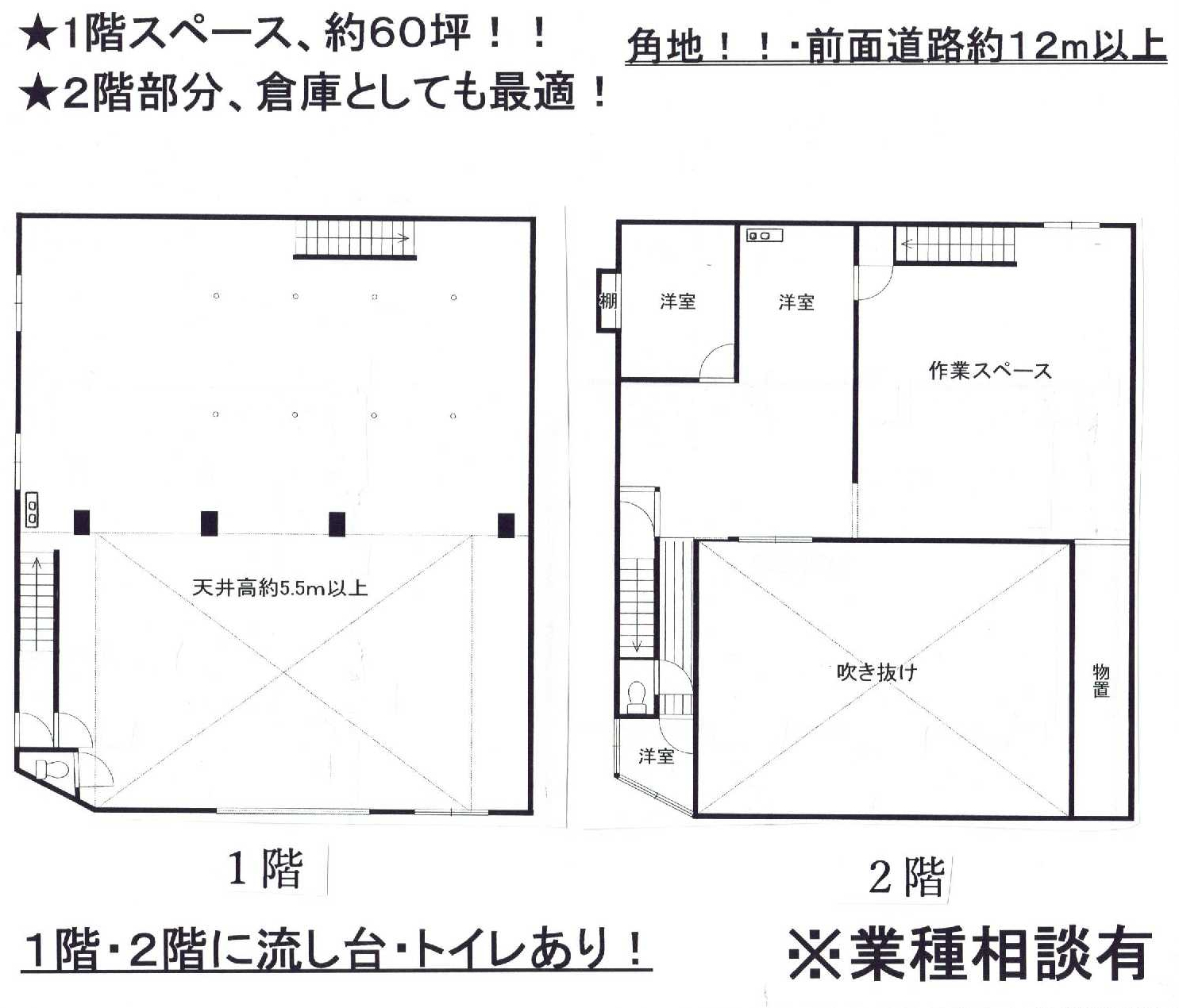 家賃保証加入要、業種相談、トイレ専用、24時間使用可、角地物件、1階:174.90㎡2階:98.31㎡、、定期借家契約5年(再契約可)、一棟貸、現状渡し